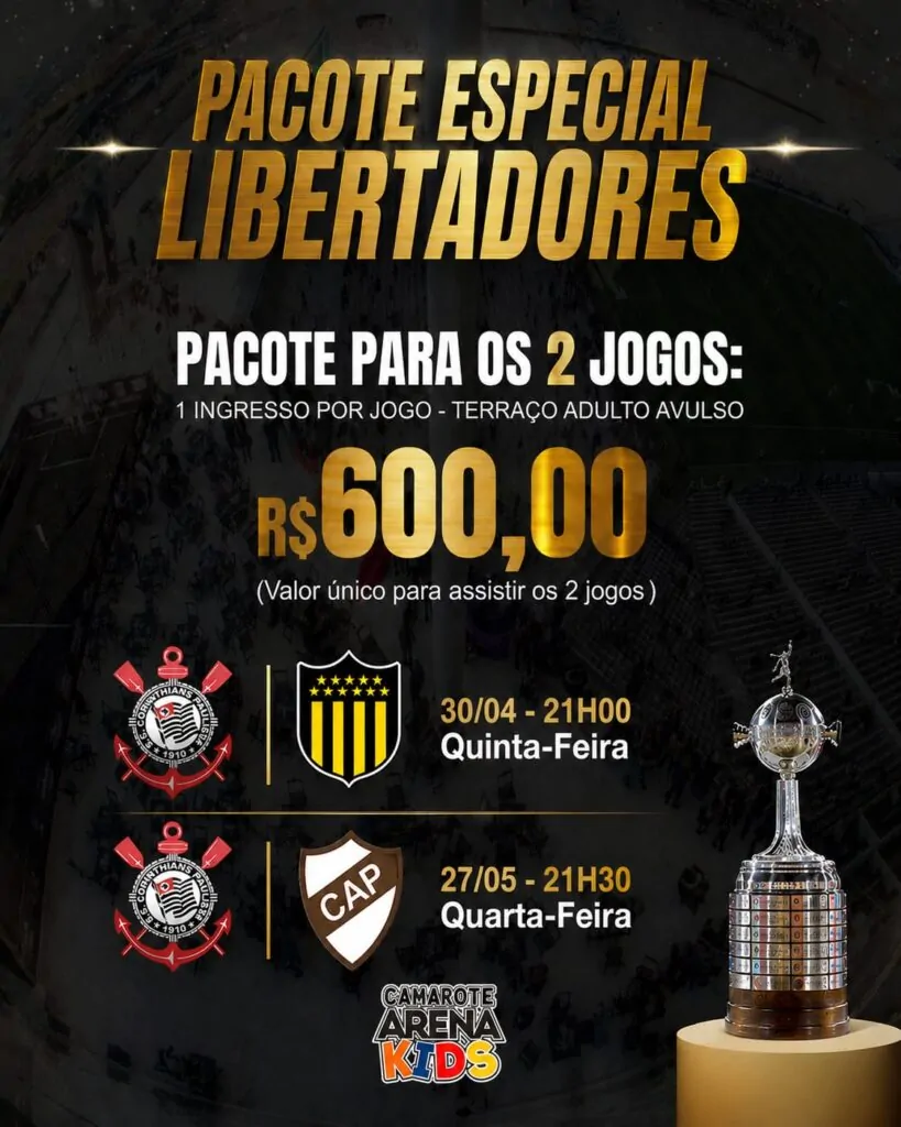 *Pacote Inclui 20 ingressos para assistir a partida de futebol no Camarote Arena Kids e 01 vaga no estacionamento.